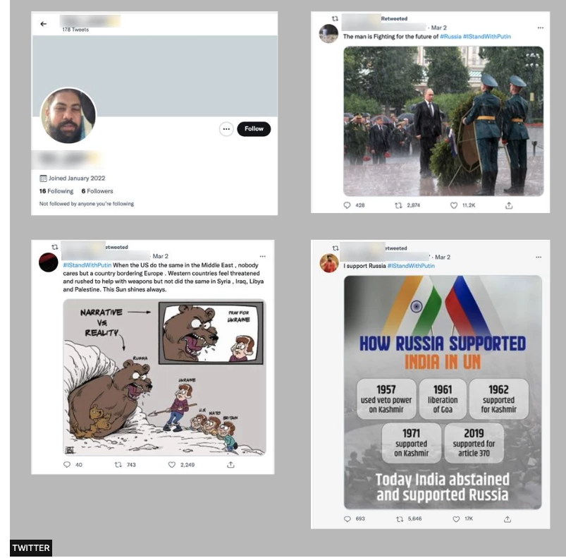 BBC рассказало о том, как в начале войны российская пропаганда использовала фотографии известных блогеров из Индии, Пакистана, Южной Африки и Нигерии для создания фейковых аккаунтов в Твиттере и продвижения хештега #IStandWithPutin или #IStandWithRussia.